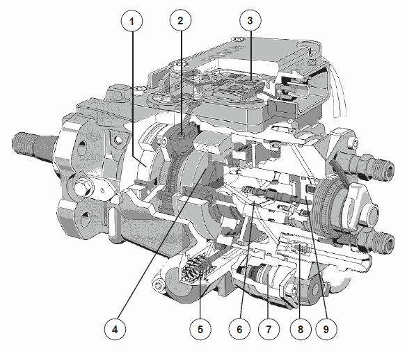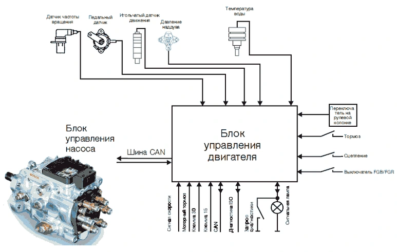 Блок управления обрабатывает данные датчиков и управляет объемом впрыска и началом впрыскивания ТНВД в зависимости от хранящихся в памяти характеристик.
