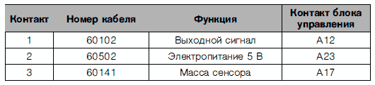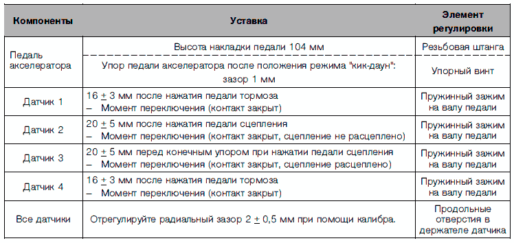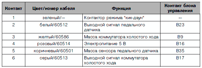 Педальный датчик передает команду водителя дальше на блок управления. В зависимости от положения педали потенциометр определяет значения углового градуса, которые передаются на блок управления в качестве параметров деления напряжения. Положение холостого хода определяется блоком управления через предохранительный выключатель. Через второй выключатель, выключатель режима "кик-даун", информация "режим резкого ускорения "кик-даун" включен" передается на элемент управления коробкой передач.
