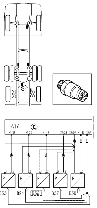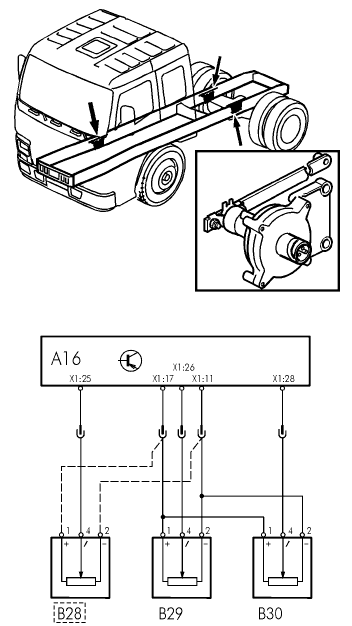 Датчик уровня переднего моста может быть расположен на правой или на левой стороне, в зависимости от варианта, но он всегда обозначается как B 28.