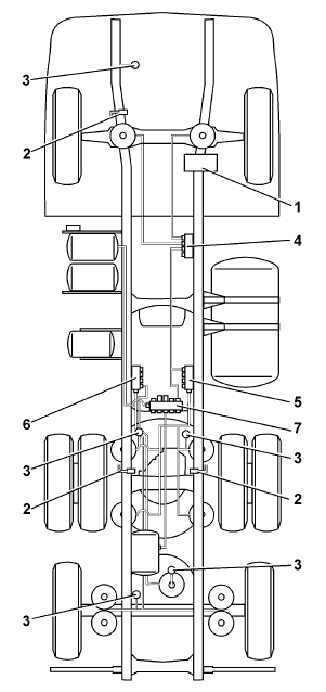 Узел электромагнитного клапана ведущего моста состоит из трех электромагнитных клапанов, одного центрального клапана и двух клапанов, контролирующих пневмоцилиндры на правой и левой стороне ведущего моста.