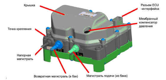 Блок подачи мочевины включает в себя насос, фильтр, нагреватель, три магистрали мочевины, интерфейс взаимодействия с ECU (основной контроллер работы двигателя). Жидкостные магистрали включают: всасывающую магистраль подачи мочевины из бака и напорную магистраль на форсунку;