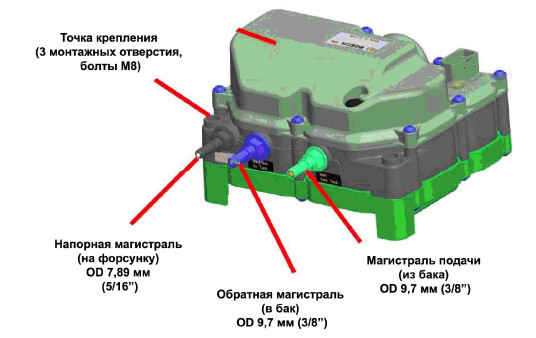 ECU-интерфейс включает в себя силовую магистраль от автомобильных аккумуляторов, pin температурного контроля магистрали и др. Производительность блока – до 20кг раствора мочевины в час, рабочее давление – 5Атм, допустимая температура раствора мочевины - от -5 до +70°С.