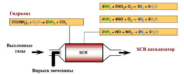 Принцип работы SCR-технологии состоит в следующем: выхлопные газы направляются турбонагнетателем в выпускной тракт, согласованным образом в выпуском тракте через специальную форсунку распыляются порции раствора мочевины, капельки мочевины нагреваются выхлопными газами и входят в реакции гидролиза и пиролиза с выходом аммиака NH3, и уже высвободившийся NH3