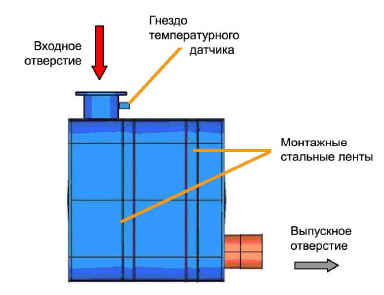 Рисунки ниже описывают внешнее устройство заключенного в оболочку из нержавеющей стали SCR-глушителя применительно к случаю дизельного двигателя WP12. Контейнер из нержавеющей стали содержит внутри себя SCR-катализатор и систему глушителя; теплоизоляционный материал проложен вдоль нижней панели контейнера: рабочая температура здесь может достигать 200°C. Магистраль с фланцем – впускная, а другая магистраль, простая – выпускная. Монтажные отверстия для температурных датчиков имеются как перед входом в каталитическую систему, так и после нее, но система DeNOx 2.2 предусматривает установку только одного температурного датчика – перед катализатором.