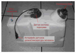 Бак для раствора мочевины изготавливается из пластика, имеет собственный вес порядка 3кг и размеры 550х450x200, оснащен интегрированной системой подогрева, см. ниже. Мониторинг состояния бака обеспечивают датчик уровня жидкости и датчик
