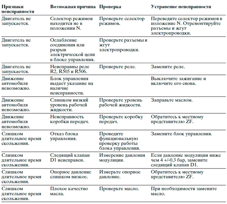 Убедитесь в том, что система зарядки и аккумулятор находятся в хорошем рабочем состоянии. Проверьте электрические разъемы и соединения согласно электрической схеме для автоматической коробки передач ZF.