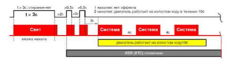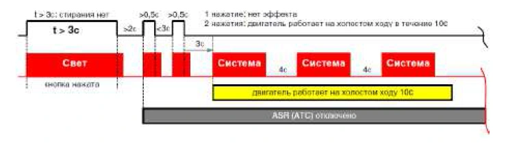Продолжительность функционального теста проверки исправности контрольной лампы ASR показывает, сконфигурирована функция ASR или нет. Без ASR - 1,5 секунды; с ASR(ATC) – 3 секунды. (так же, как и контрольная лампа ABS).