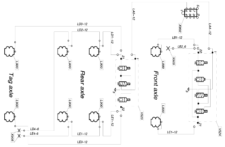 • Подвеска средней и задней осей управляется однотипными блоками, содержащими по три клапана. их обозначения: