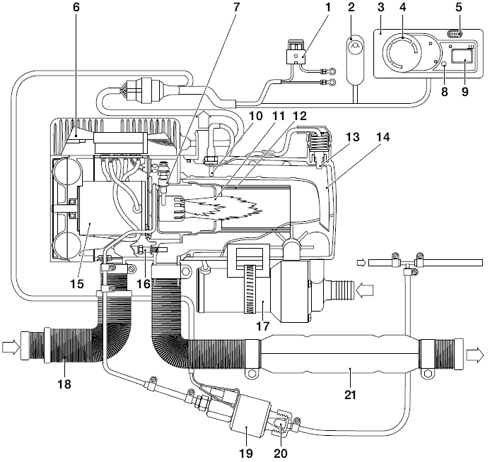 топлива, или теплообменник забирает слишком мало тепла. При чрезмерном нагреве обогревателя датчик перегрева определяет это состояние, и электронный блок прекращает впрыск топлива. При этом сгорание останавливается. Вентилятор обогревателя остается включенным для охлаждения обогревателя.