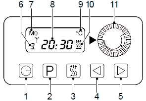 Температура в кабине измеряется датчиком температуры в кабине (5) и сравнивается с температурой, заданной на панели управления (3). При достижении заданной температуры панель управления (3) выключает вентилятор обогрева, пока температура в кабине не опустится ниже заданного значения, затем вентилятор обогрева включается снова.