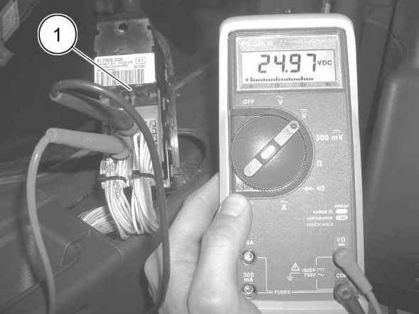 При измерении величин напряжения следует включить зажигание и вставить штекер дверного модуля (1). На этом примере проводится замер питающего напряжения дверного модуля со стороны водителя (А451) между Pin Х1/4 - положительным проводом и Pin Х1/8 - отрицательным проводом. Результат замера, проведенного мультиметром FLUKE 77, составляет 24,97 В (напряжение аккумулятора).