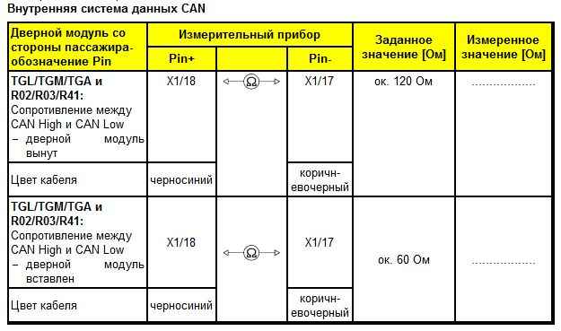 При указанном в этой главе контрольном перечне (пример: контрольный этап 1) обозначает первый контрольный контакт как "Pin X1/18" и второй контрольный контакт как "Pin X1/17". При помощи мультиметра измеряется величина сопротивления между этими контактами. Измеряется при этом непосредственно на дверном модуле. Между приведенными в колонках Pin+ и Pin- контрольных контактах находится вид измерения, настраиваемый на измерительном приборе (мультиметре).