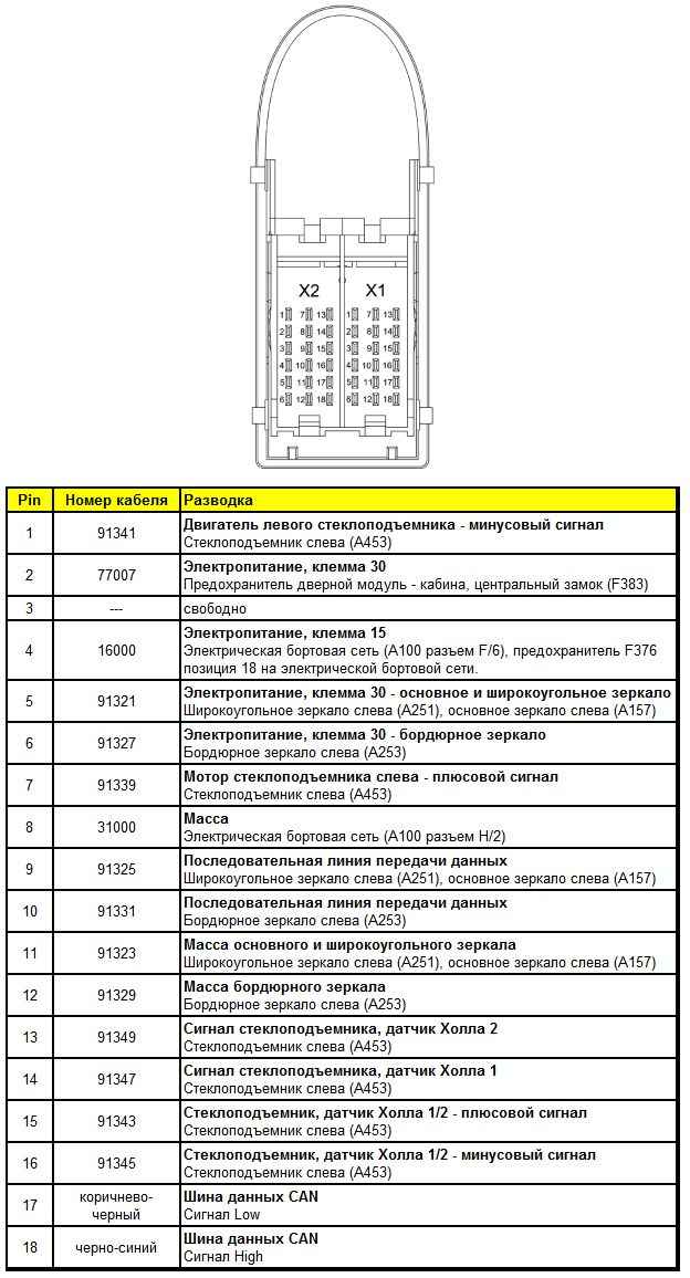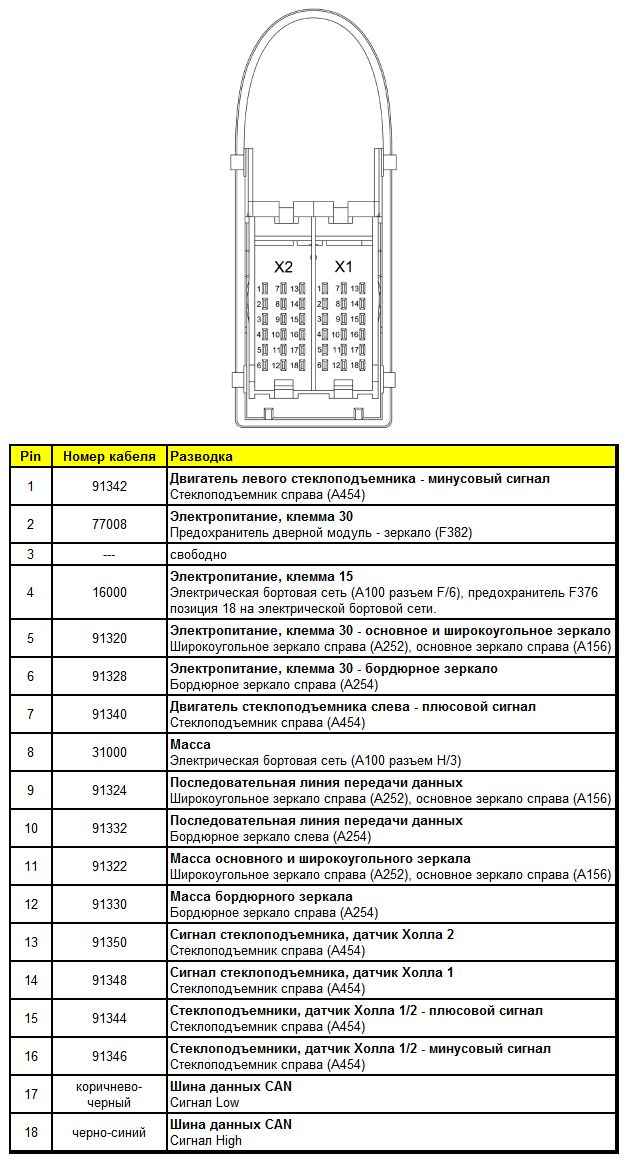 Штекерная разводка контактов дверного модуля со стороны пассажира (A452)