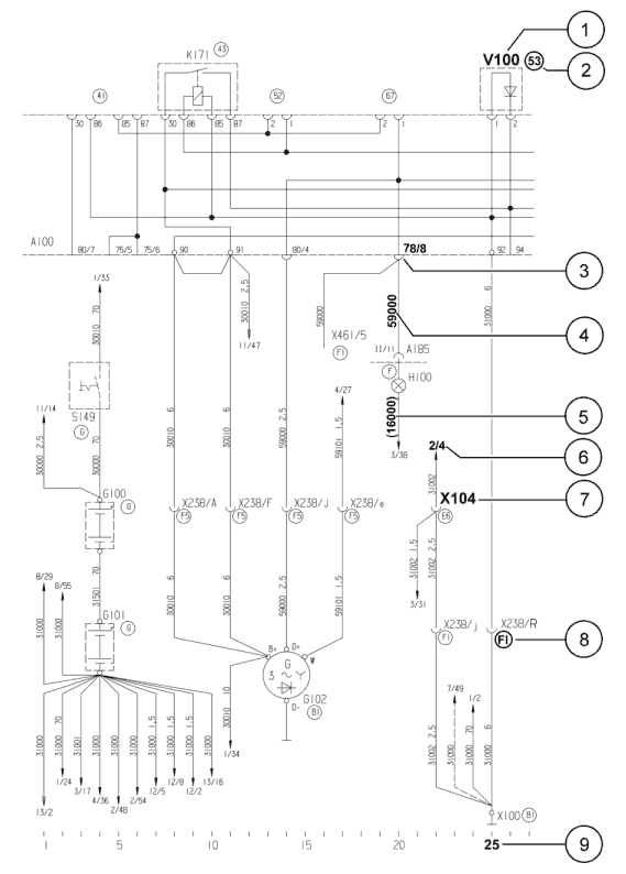 - 1 Обозначение электрической детали (пример: диод V100 на электрической бортовой сети, место 53)