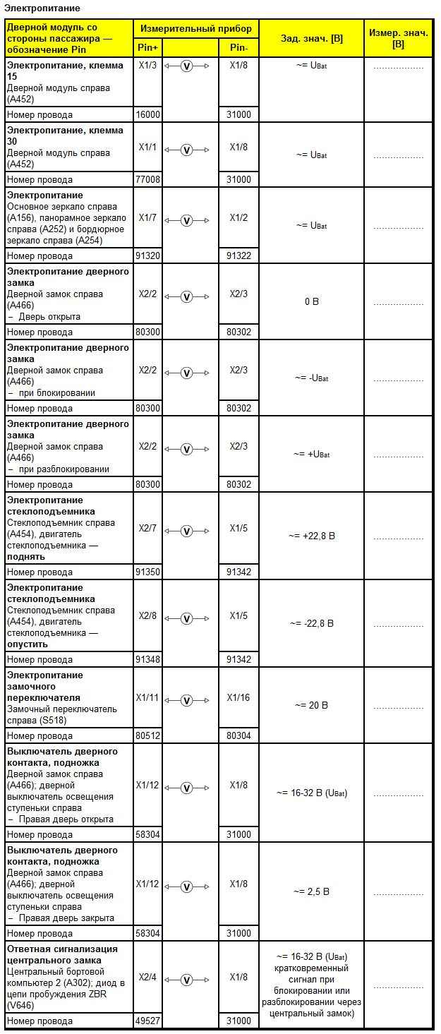 В приведенном в этом разделе списке этапов проверки (пример: этап проверки 1) первый контрольный контакт обозначается как Pin X1/3, а второй контрольный контакт — Pin X1/8. С помощью мультиметра между этими Pin измеряется величина напряжения. Измеряется при этом непосредственно на дверном модуле. Между столбцами Pin+ и Pin- указывается настраиваемый на измерительном приборе (мультиметре) тип замера.