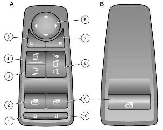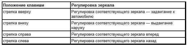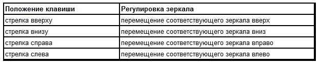 Нажатием кнопки «Регулировка зеркала» и в зависимости от настройки кнопки предварительного выбора зеркал включаются следующие функции: