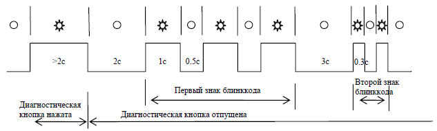 Диагностика двигателя проводится нажатием и удерживанием диагностической кнопки более 2с. После отпускания кнопки диагностическая лампа промигает блинккод неисправности двигателя в виде нескольких длинных вспышек (первый знак блинккода) и нескольких коротких вспышек (второй знак блинккода).