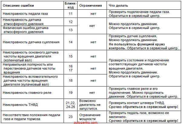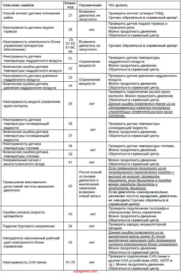 Пример: при физической ошибке датчика температуры наддувочного воздуха (блинккод 32) диагностическая лампа промигает 3 длинные вспышки, пауза, 2 короткие вспышки.