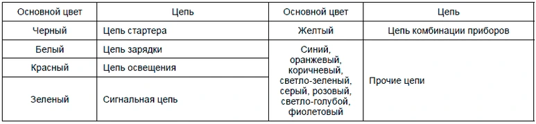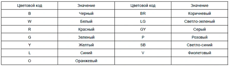 Все провода различаются по цветовой маркировке изоляции. Провода, относящиеся к основному жгуту проводов системы, имеют однотонную окраску. Провода, относящиеся к вспомогательным цепям системы, имеют цветные полосы. Для обозначения размера и цвета проводов используются приведенные ниже коды.