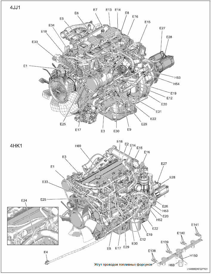 - H69 Жгут проводов двигателя – Жгут проводов топливных форсунок (4HK1)