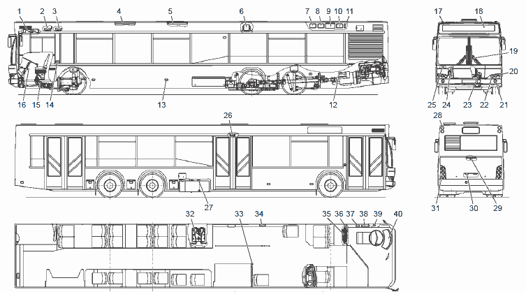 лоочистители; 20 - указатель поворота; 21 - противотуманные фары; 22 - фары головного света; 23 - звуковые сигналы; 24 - стеклоомыватель; 25 - внешние кнопки открывания двери водителя; 26 - фонари освещения выходов; 27 - датчик уровня топлива; 28 - задние верхние фонари; 29 - выключатель блокировки пуска двигателя; 30 - освещение номерного знака; 31 - задние фонари; 32 - аккумуляторные батареи; 33 - кнопки требования остановки; 34 - кнопки требования остановки инвалидом; 35 - блок коммутации; 36 - блок управления системы автоматического пожаротушения; 37 - розетка; 38 - дополнительная панель