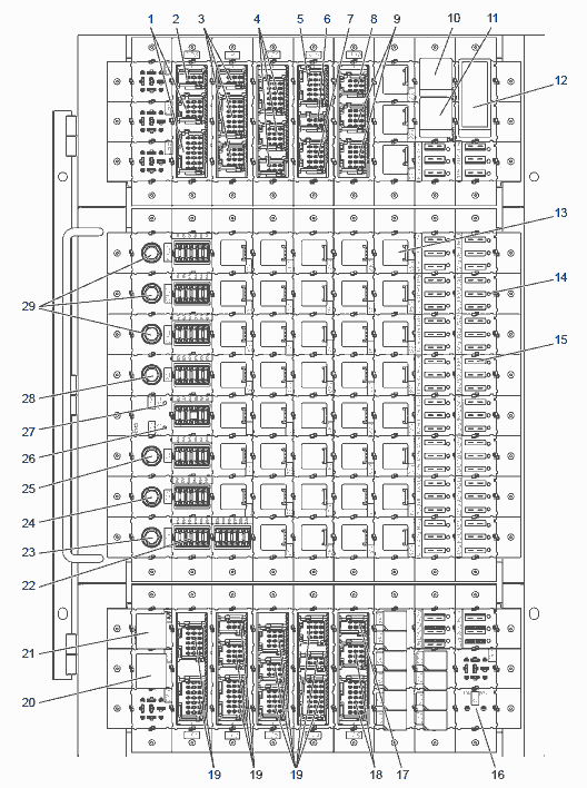 1 - разъем жгута дверей; 2 - разъем жгута электрооборудования для инвалидов; 3 - разъем главного жгута; 4 - разъем жгута управления двигателем; 5 - разъем жгута ГМП; 6 - разъем жгута системы пожаротушения; 7 - разъем жгута ABS/ASR; 8 - разъем жгута отопителей; 9 - разъем жгута пневмодатчиков; 10 - реле-прерыватель контрольной лампы стояночного тормоза; 11 - реле-прерыватель системы оповещения при движении задним ходом; 12 - реле поворотов; 13 - промежуточные реле;
