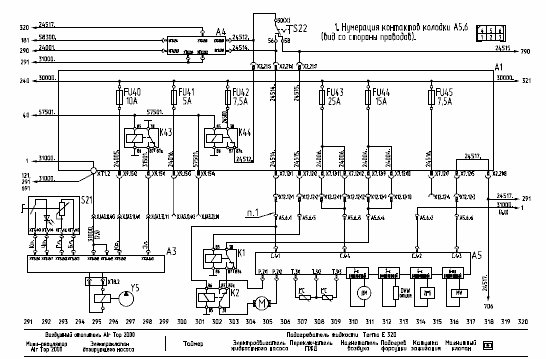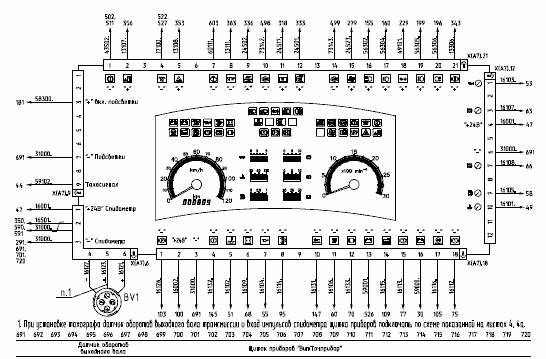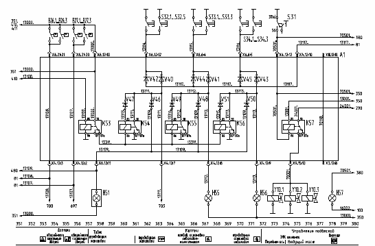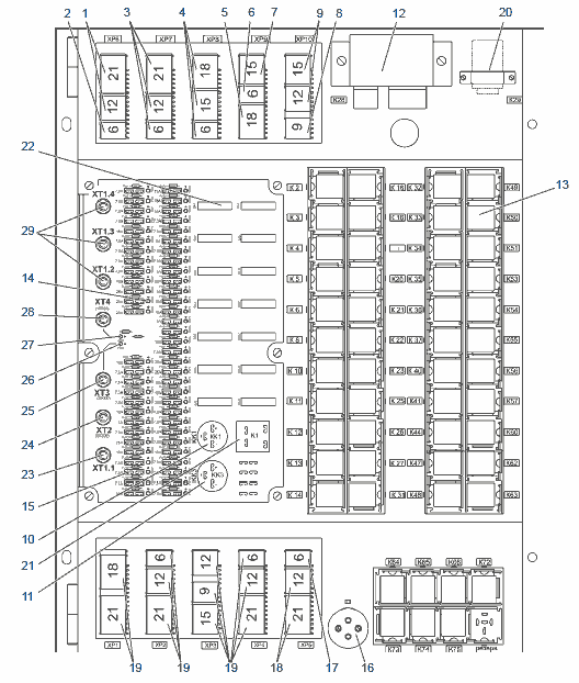 к разъемам XР1…XР4 – жгуты щитка приборов, к разъемам XР5.12, ХР5.21 - жгут передка, к разъемам XР6.12 и ХР6.21 – жгут дверей, к разъему XР7 - главный жгут, к разъему XР8 – жгут управления двигателем, к разъему XР9.6 – жгут системы пожаротушения, к разъему XР9.15 – жгут ABS, к разъему X9Р.18 – жгут ГМП, к разъемам XР10.12 и ХР10.15 – жгут пневмодатчиков, к разъему XР10.9 – жгут отопителей.
