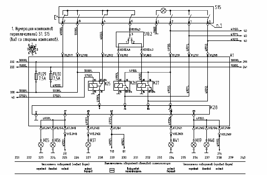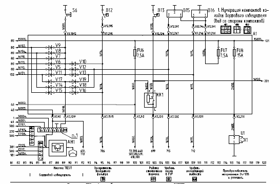 14 - светодиоды исправности предохранителей; 15 - плавкие предохранители; 16 - розетка; 17 - разъем жгута боковых габаритных огней; 18 - разъем жгута передка; 19 - разъем жгута панели приборов; 20 - реле стеклоочистителя; 21 - реле стартера; 22 - диодные сборки; 23 - общая «масса»; 24 - подача питания на стартер; 25 - питание с АКБ; 26 - контрольная лампа исправности цепи АКБ; 27 - контрольная лампа исправности цепи генератора; 28 - питание цепи 15000;