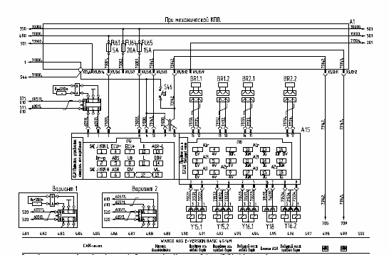 а) - KNORR-BREMSE ABS/ASR ЕU12 4S/4K; б) - WABCO ABS E-VERSION BASIC 4S/4M; в) - ABS/ASR «Экран», г) - KNORR-BREMSE ABS/ASR ЕU12 6S/6K; д) - WABCO ABS E-VERSION BASIC 6S/6M