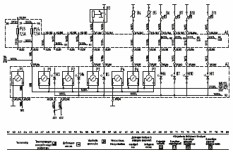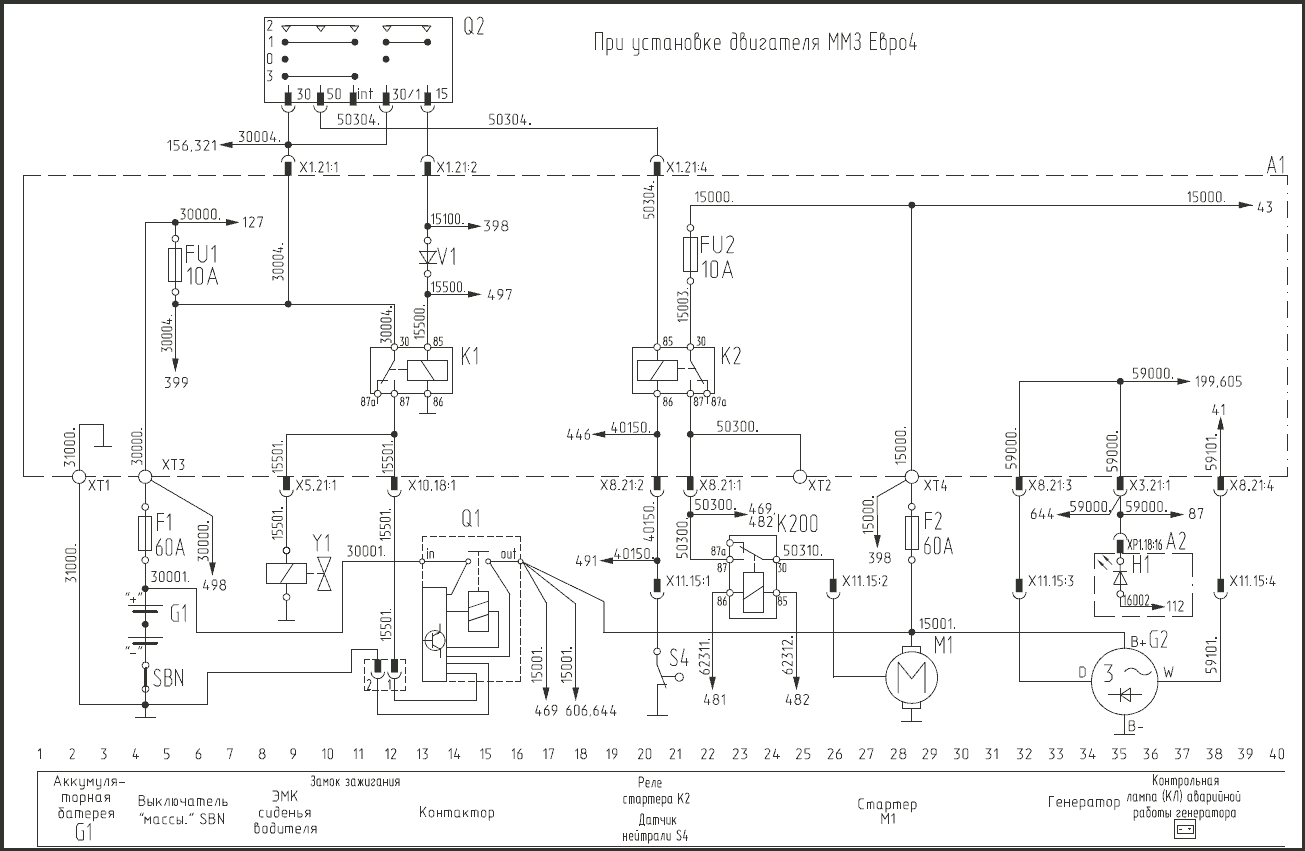 1 - контрольная лампа исправности плавкого предохранителя; 2 - плавкий предохранитель; 3 - питание после замка зажигания; 4 - промежуточное реле; 5 - питание с АКБ; 6 - подача питания на стартер; 7 - общая «масса»; 8 - контрольная лампа исправности цепи АКБ; 9 - диод; 10 - контрольная лампа исправности цепи после замка зажигания; 11 - розетка; 12 - жгут панели приборов; 13 - жгут передка автобуса; 14 - жгут дверей; 15 - главный жгут; 16 - жгут ГМП; 17 - жгут моторного отсека; 18 - жгут управления двигателем; 19 - жгут отопителей; 20 - жгут резервов; 21 - жгут системы автоматического пожаротушения; 22 - жгут пневмодатчиков