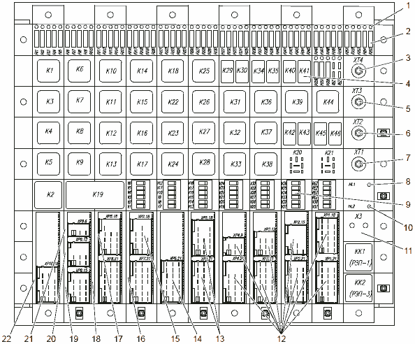 Блок коммутации 14 расположен в отсеке по левому борту. В блоке коммутации расположены предохранители, промежуточные реле, реле поворотов, импульсное реле стеклоочистителя, стартерное реле и диодные сборки, обозначение и назначение которых указаны на БК.