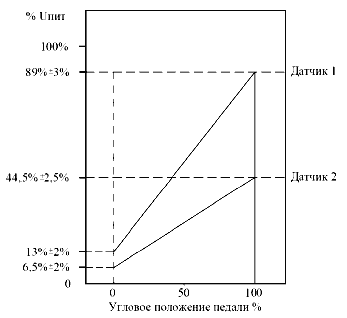 Характеристика электронной педали акселератора приведена на рисунке 58. Входное напряжение питания педали Uпит = 5 +- 0,5 В принято за 100%. В соответствии с характеристикой рассчитывается напряжение датчиков в зависимости от положения педали. Положение педали определяется при сравнении ее текущего положения и положения при максимальной подаче топлива.
