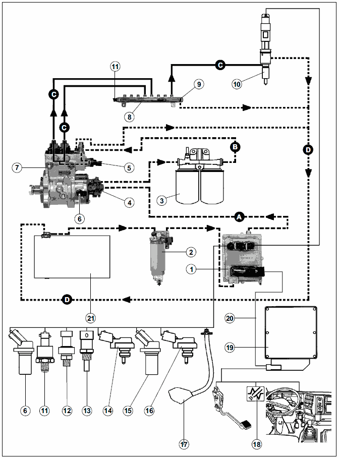 - (D) - система возврата в топливный бак (21).