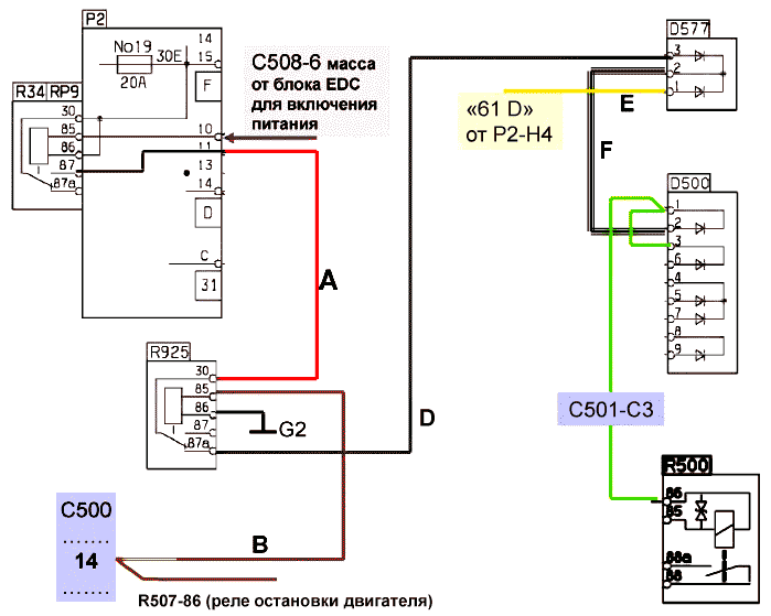 1. Между P2/D11 и новым реле R925-30 проложите и подсоедините красный провод A.