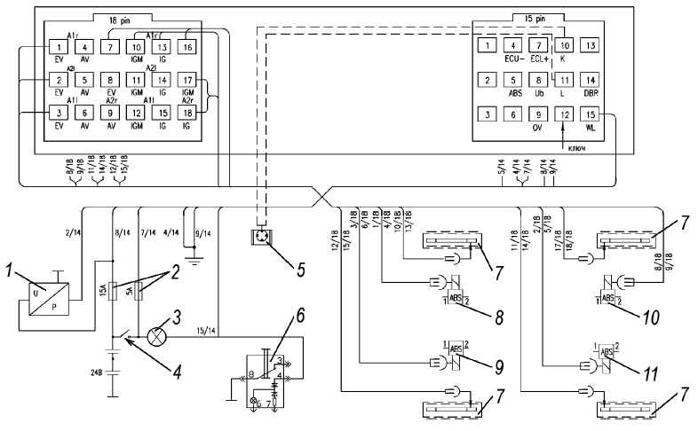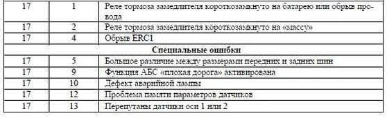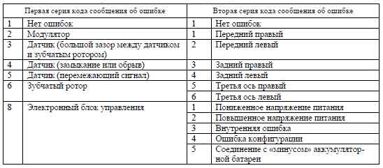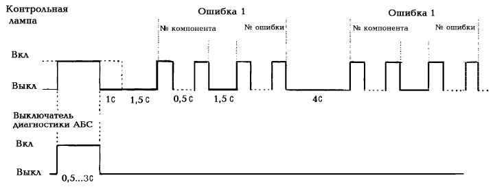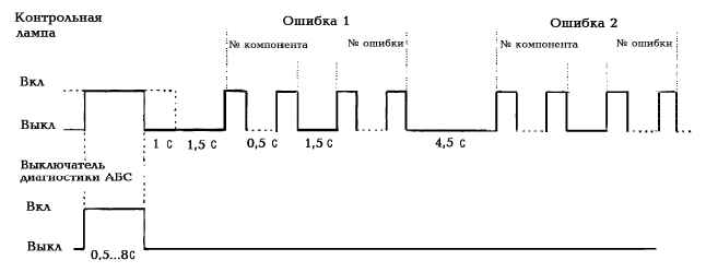 При этом если электронным блоком фиксируется новая ошибка, появившаяся во время считывания, или если контрольная лампа соединена с минусом на время более 6,3 с, то система выходит из режима диагностики. Если сигнализатор «АБС тягача» был соединен с минусом на время более 15 с, то фиксируется обрыв сигнализатора «АБС тягача».