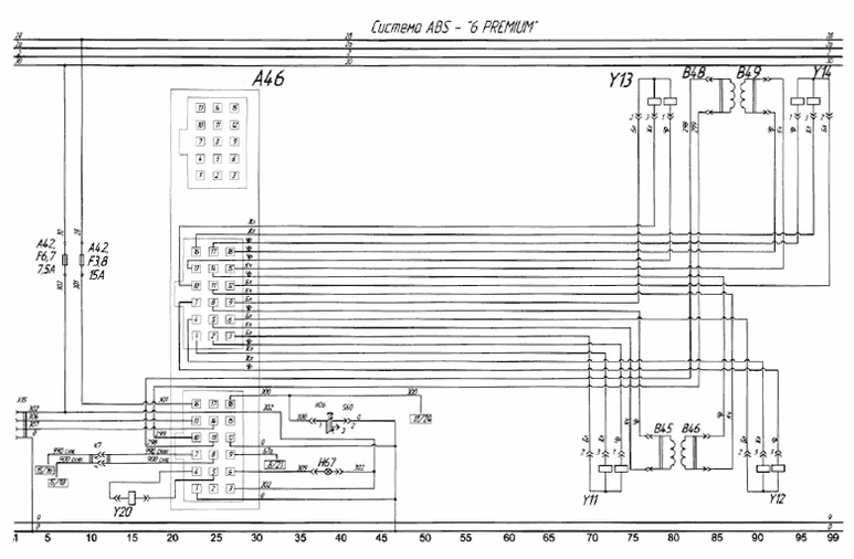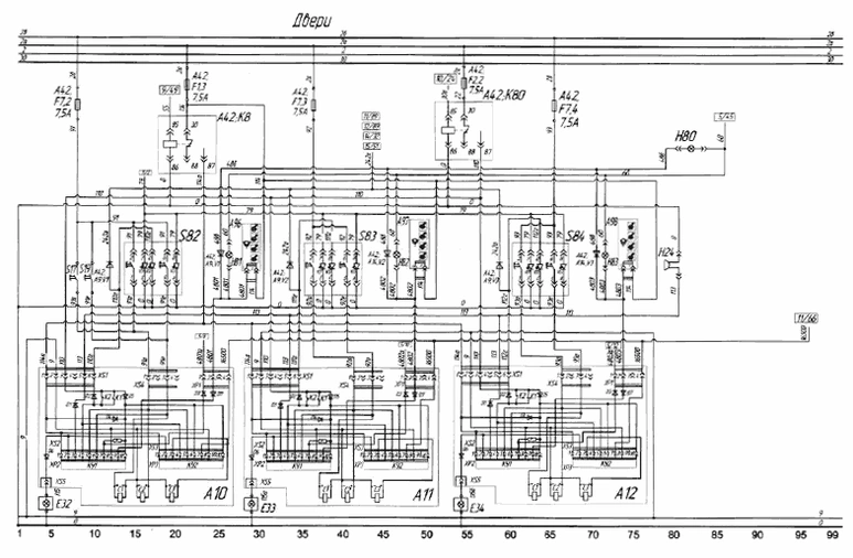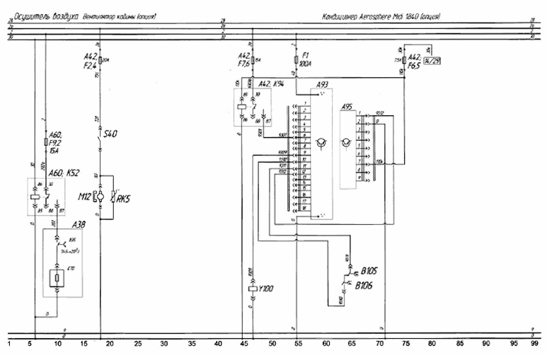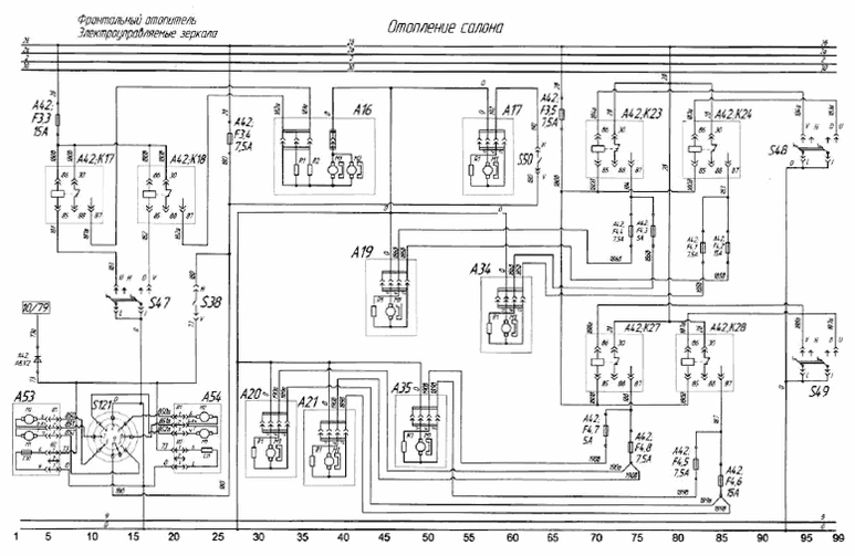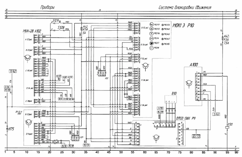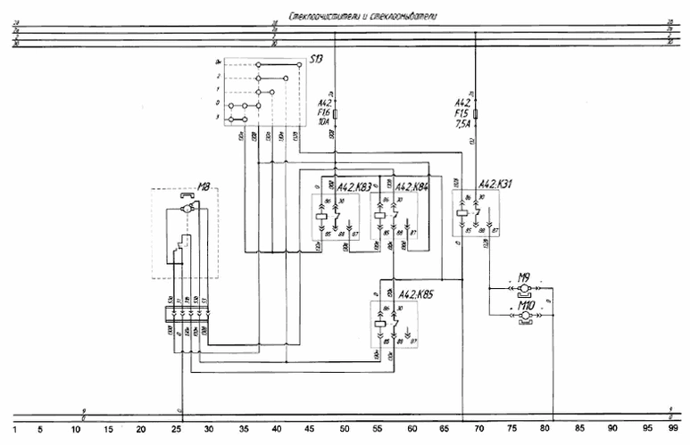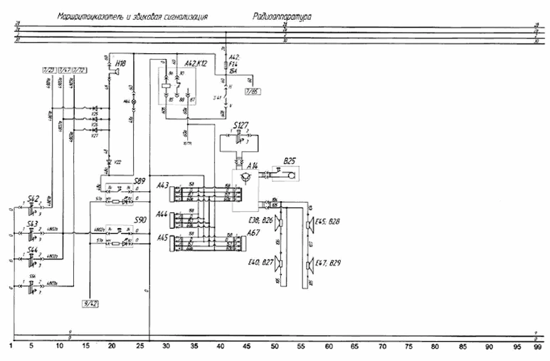 Провода №№ 2, 2а, 26, 2ж, 30, 9, 0 проходят через все листы схемы. Они показаны сверху и снизу на каждом листе. Для других проводов, проходящих по двум листам схемы и более, принята следующая система связи: на каждом листе провод условно оборван и на месте обрыва проставлены в прямоугольнике через дробь два числа, первое из которых обозначает номер листа, на котором данный провод начинается (продолжается), а второе - номер зоны на этом листе. Нумерация зон проставлена внизу на каждом листе.