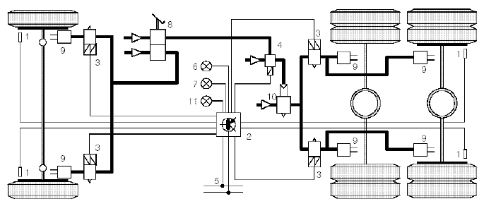 Следующая схема иллюстрирует один из примеров установки компонентов ABS/ASR на трёхосном транспортном средстве. В этой конфигурации используются 4 датчика скорости колеса и 4 модулятора.