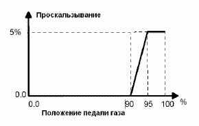 Это даёт водителю возможность обеспечить более высокое проскальзывание колёс при нажатии на педаль акселератора. График ниже показывает стандартные настройки для зависимости проскальзывания от положения педали акселератора. Эта установка может быть изменена на различные значения или полностью выключена с помощью параметра EEPROM ECU.