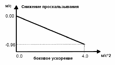 ECU оценивает боковое ускорение по скоростям колес передней оси. С целью обеспечения лучшей устойчивости транспортного средства, в зависимости от значения бокового ускорения происходит снижение допустимого проскальзывания. Следующий график показывает характеристику снижения допустимого проскальзывания.