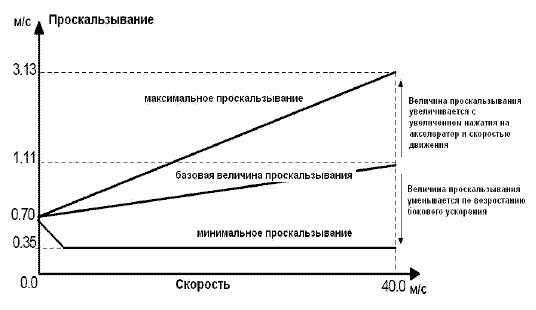 Величина продольного скольжения увеличивается в зависимости от положения педали акселератора и скорости транспортного средства.