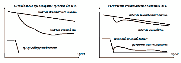 При движении по дороге с низким коэффициентом сцепления, инерционность машины может стать причиной пробуксовки колёс на ведущей оси (ях). Особенно это возможно при переключении на низшие передачи или торможение при применении ретардера с подключенной карданной передачей. Это может привести к частичной блокировке колёс и к неустойчивости транспортного средства. Цель управления тормозным моментом состоит в том, чтобы в описанных ситуациях управлять пробуксовкой колес ведущих осей. Для преодоления инерции машины, ECU отправляет необходимое значение вращающего момента в ECU двигателя.