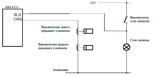 Если усилители оборудованы выключателями, указывающими неисправность усилителя, то эти выключатели можно связать с ABS ECU, как показано в следующей диаграмме: