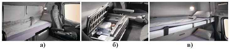 Внизу за спинками сидений расположено спальное место (рисунок 1.4, а), под которым размещены три вещевых отсека, средний из которых может быть использован под холодильник объемом 25 л (рисунок 1.4, б). Кабина также может оснащаться вторым, расположенным над нижним, спальным местом