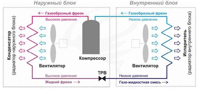 Компрессор, конденсатор, ТРВ и испаритель соединены медными трубами и образуют холодильный контур, внутри которого циркулирует смесь хладагента и небольшого количества компрессорного масла. В процессе работы кондиционера происходит следующий процесс: