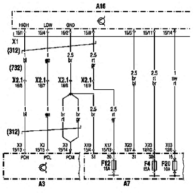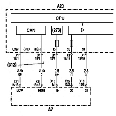 - F28-A7: Предохранитель блока управления FR система управления движением, клемма 15