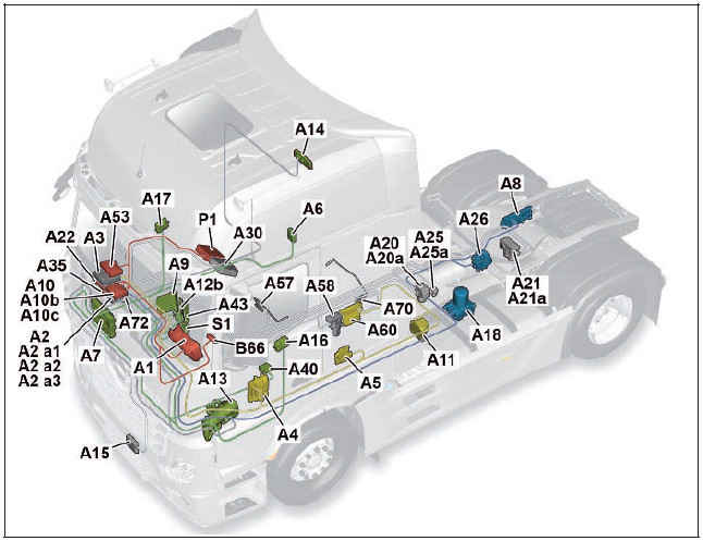LIN data buses serve as redundancies between the sensor and actuator module, cab (SCA) control unit (A7) and the sensor and actuator module, chassis (SCH) control unit (A8) as well as between the instrument cluster control unit (ICUC) (A1) and the Electronic Air>Processing Unit (EAPU) control unit (A18).