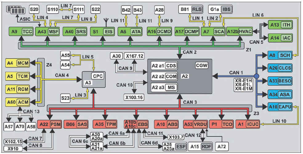 • The central gateway control unit (CGW) (A2) routes the respective messages from the exterior, interior, frame, telematics and diagnostic CAN (CAN 1, 2, 3, 9 and 10).