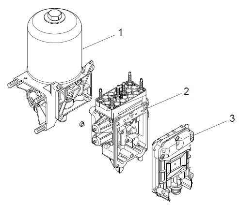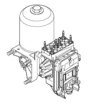 Воздухоосушитель (1) состоит из корпуса и контейнера с влагопоглотителем. К воздухоосушителю подсоединяется клапан защиты контуров (2), который состоит из четырех защитных клапанов (по одному на каждый контур), а также из приоритетного клапана для контура стояночного тормоза и контура тормоза прицепа. Блок управления (3), который расположен вне клапана защиты контуров, обменивается данными с другими системами автомобиля по шине CAN и проверяет и регулирует