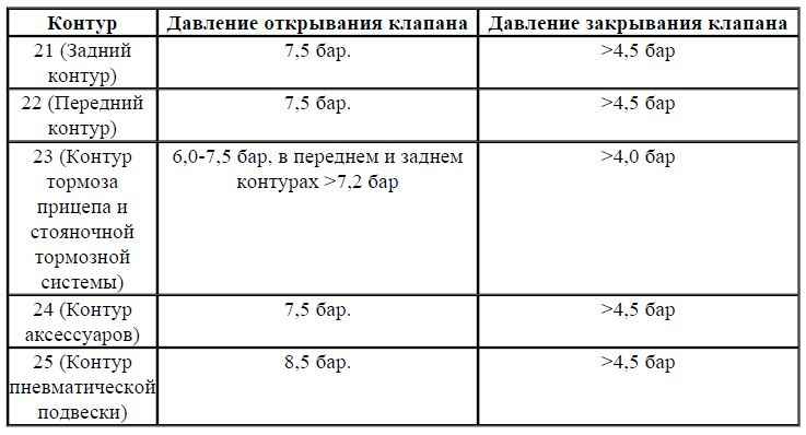 Значения давления в данной ниже таблице может быть трудно измерить, и они могут варьироваться в зависимости от используемого метода измерения. Эти значения давления следует использовать только в качестве справочных при поиске неисправностей. Значение давление с отклонением от нормы не обязательно подразумевает, что имеется неисправность в клапане защиты контуров или любом другом элементе системы сжатого воздуха.