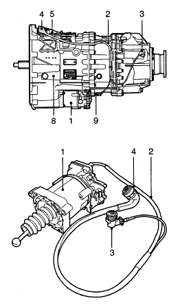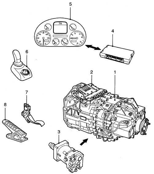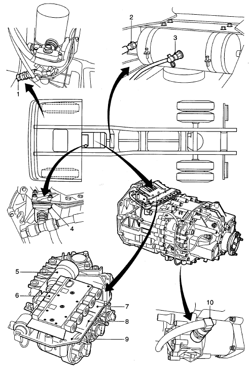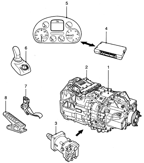 Коробка передач AS Tronic (4) оснащена сухим однодисковым сцеплением с автоматическим управлением (1). Модулятор коробки передач (3) состоит из электронного блока, различных датчиков, клапана ограничения давления (5) и пневматического механизма переключения. Автоматическое включение и выключение сцепления обеспечивается узлом привода сцепления (2) за счет использования сжатого воздуха.